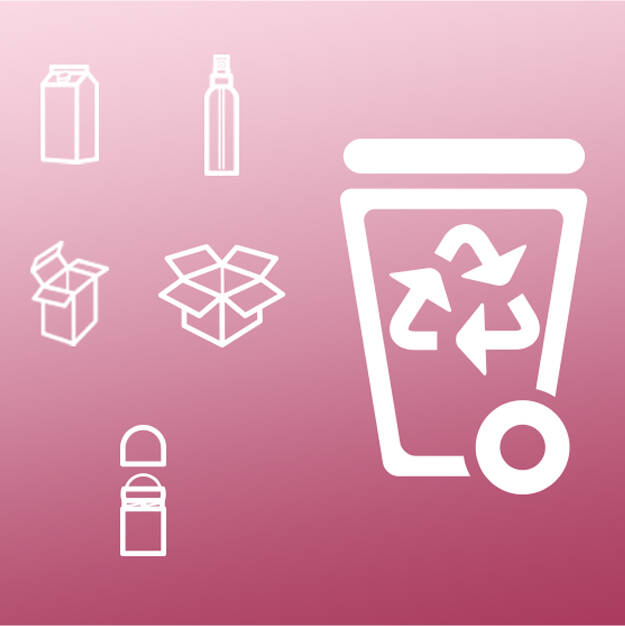 يمكن التخلص من الورق والزجاج والمعدن والزجاجات البلاستيكية في سلة إعادة التدوير. يمكنك أن تضعي المستحضرات التي تحمل الرموز التالية في سلة إعادة التدوير بأمان.